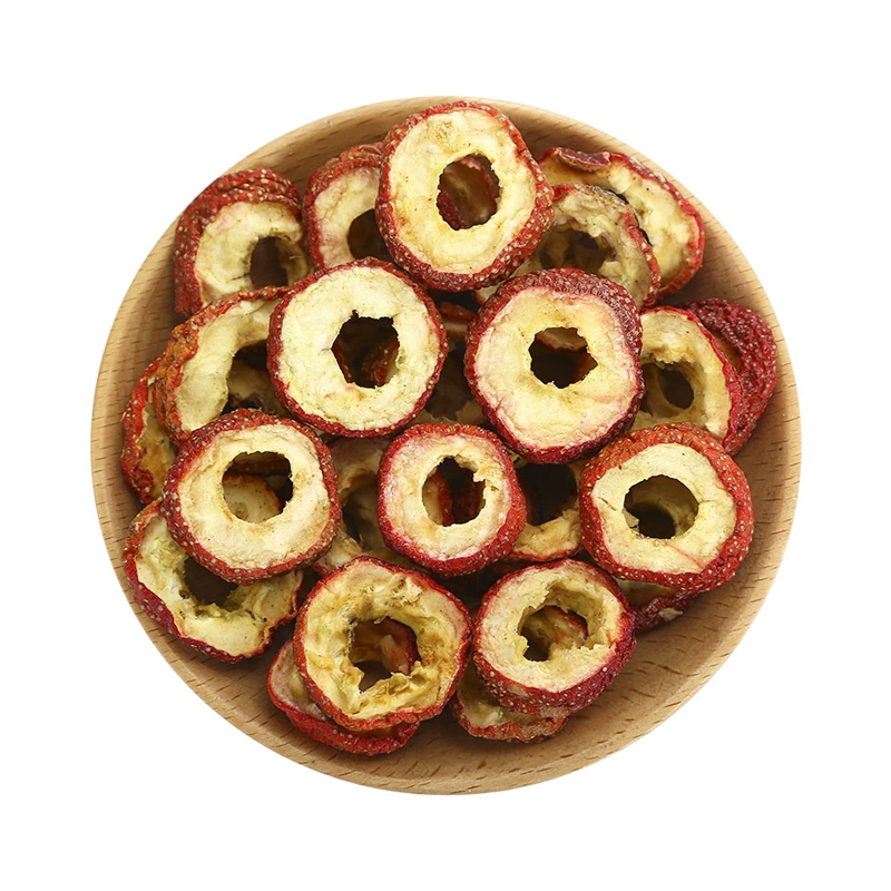 【性状】本品呈类纺锤形或椭圆形,长6~20mm,直径3~10mm。表面红色或暗红色,顶端有小凸起状的花柱痕,基部有白色的果梗痕。果皮柔韧,皱缩;果肉肉质,柔润。种子20~50粒,类肾形,扁而翘,长1.5~1.9mm,宽1~1.7mm,表面浅黄色或棕黄色。气微,味甜。